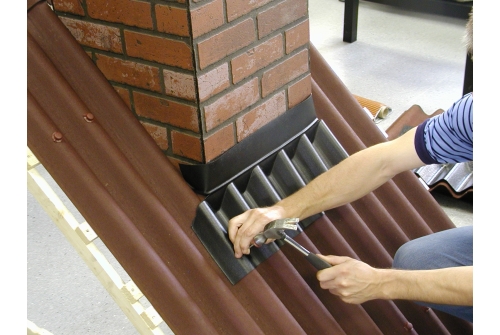 Покрывающий фартук закрывает стык между ондулином и вертикальной стеной или печной трубой.