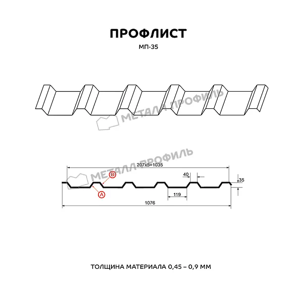 Профнастил с высотой гофры 35 мм. Имеет плоские верхние грани трапеций, без дополнительных рёбер жёсткости. Однако сама форма профиля с чередованием широких нижних и узких верхних площадок придаёт данному профнастилу хорошую прочность на изгиб и стойкость к скручиванию. Благодаря своим эксплуатационным качествам, указанный профлист зачастую используется в различных сферах. Чаще всего это: обшивка фасадов, перекрытие кровли, строительство каркасных сооружений, установка ограждений, заливка фундамента (в качестве армирующей основы ), оборудование внутренних перегородок в торговых зданиях. МП-35 обладает небольшим весом, что существенно упрощает его транспортировку и установку. Исходя из сферы использования гофрированного листа, мы предлагаем вам выбрать требуемую толщину металлопроката – от 0,45 до 0,9 мм.Покрытие ECOSTEEL®: