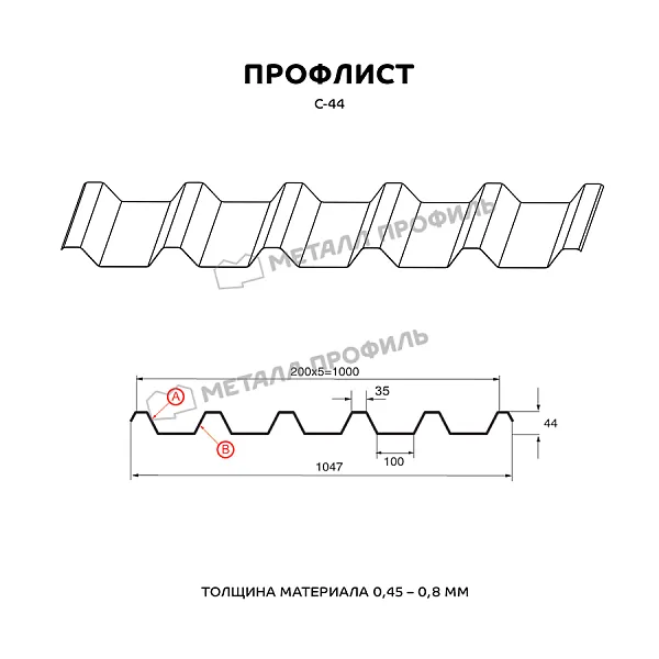 Профлист МЕТАЛЛ ПРОФИЛЬ С-44х1000-B (VikingMP-01-RR32-0,45) — популярный материал для обустройства профилированного листа. Изначально он представляет собой лист оцинкованной стали с покрытием. Общая толщина металла с оцинковкой и полимерным покрытием — 0.45 мм. Проходя процедуру холодного проката, сталь принимает волнообразный вид. Несущая способность профилированного листа на порядок выше плоского.